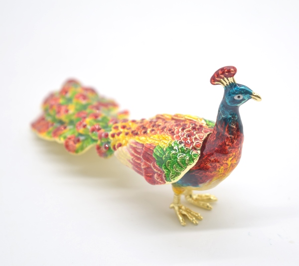 孔雀といえば緑か青のイメージですが、赤やピンクといった暖色系の配色を用いたものもご用意してみました。