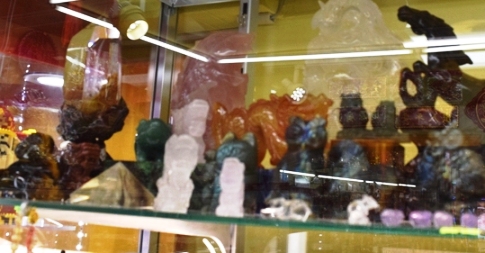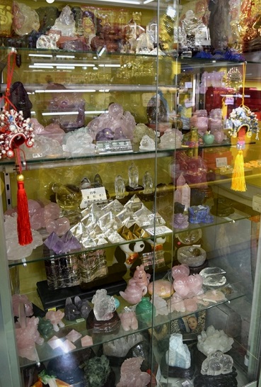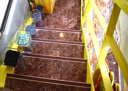 二階への階段の脇には色とりどりの天然石チップが置かれています。