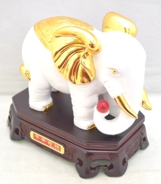 立派な台座に乗った白と金の樹脂製ゾウ。