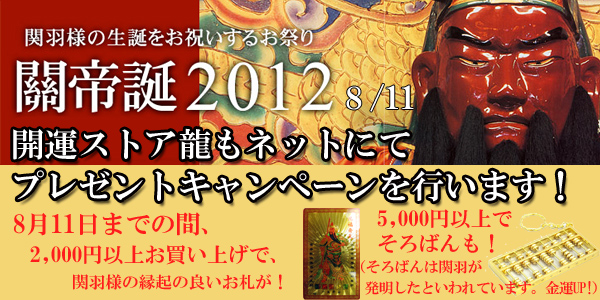 現在も、ネット価格でネットでのお買い物は大変お安くなっておりますが、関帝誕の8月11日までは関羽製品がさらに安く、さらに幅広くご提供いたします。