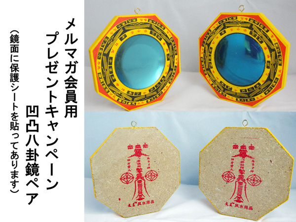 当店ではこの度、秋の大奉仕として、10月13日(土)から20日(日)までの間、商品3,000円以上ご購入のメルマガ会員の方限定に、ネットにて+100円で、八卦鏡を凹凸二つペアでプレゼントする企画を立てました。