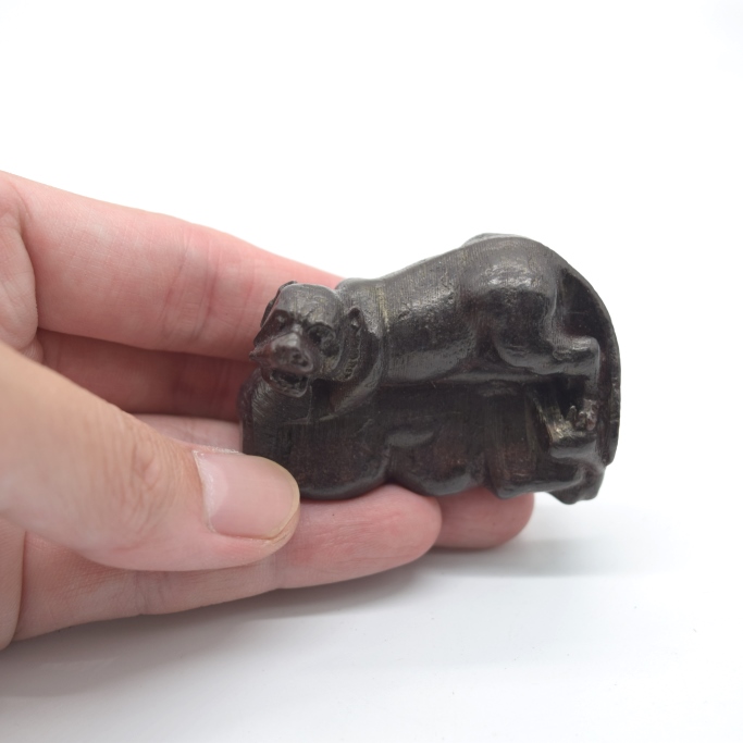 ミニチュア銅製獅子のペアと虎目石