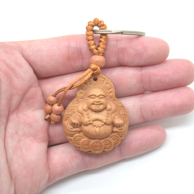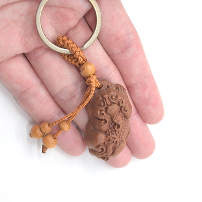 神獣などが彫られた木製キーホルダーです。