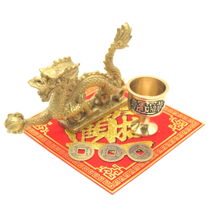 銅製品の龍銅杯・古銭とそれを飾るための敷物用福飾りがついたセット!